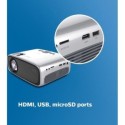PRINCIPALES CARACTÉRISTIQUESPrincipales caractéristiques Wi-Fi : Mode miroir sans fil Bluetooth : Connexion d'enceinte externe HDMI : 1 USB : 1 VGA : 1 Micro SD : 1 Sortie audio : Prise jack 3,5 mm Entrée audio/vidéo : Prise jack 3,5 mm Entrée CC: Prise CC Technologie d'affichage : LCD Source : LED Niveau de contraste : 3 000:1 Résolution : 800 x 480 pixels Rapport distance de projection/largeur de l'image : 1,4:1 Format d'image : 16/9 Mise au point : Manuel Lecteur multimédia intégré : Oui Correction du trapèze : Manuel Durée de vie des LED : Jusqu'à 30 000 h Taille de l'image projetée : jusqu’à 165 cm (65 po) Distance de projection : 80-200 cm / 24-60" Résolution prise en charge : 1 920 x 1 080 pixels Vendu avec le produitNeoPix Easy PlayDescriptif techniqueSKU: PH046EA0VU194NAFAMZModèle: NPX443/INTTaille (Longueur x Largeur x Hauteur cm): 10x21Poids (kg): 1Couleur: GrisMatériau principal: plastique