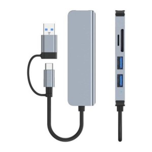Spécification : • Nom : HUB 5 en 1 USB type-C & USB 3.0 vers to 1 x USB 3.0 + 2 x USB 2.0 + Micro sd / SD • Matériel : En Alliage d'aluminium • Interface : 1 x USB 3.0 & 2 x USB 2.0 • Entrée : USB type-C / USB 3.0 • Sortie: 1 x USB 3.0 + 2 x USB 2.0 + 1 x TF Card + 1 x SD Card • Vitesse de transmission : 5Gbps • Poids : 72g • Taille : 10X3X2 cm • Couleur : Argent • Longueur de câble : 12cm