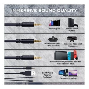 Spécifications : • Microphone : 6,0 * 2,7 mm • Sensibilité : 110±3dB • Impédance : 32?±15% • Impédance du microphone : 2.2K ? • Sensibilité du microphone : -36±3dB • LED : DC5V±5% • Fréquences : 20Hz-20KHz • Diamètre du haut-parleur : 40mm • Compatibilité avec les systèmes d'exploitation ce casque de jeu prend en charge PS4, nouvelle Xbox One, PC, ordinateur portable, Nintendo Switch, PSP, tablette, téléphone mobile, mais vous avez besoin d'un adaptateur Microsoft (non inclus) pour se connecter à la Xbox One de l'ancienne version