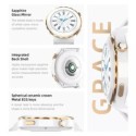 Bien qu'il s'agisse d'une smartwatch économique, la qualité de construction semble vraiment impressionnante et même si l'accent doré sur notre version ne sera pas la tasse de thé de tout le monde, son incroyable qualité de construction attirera certainement l'attention qu'il faut. De plus, avec de bonnes dimensions, 44 mm de grande taille et 11,4 mm d'épaisseur du cadre, et sa légèreté ne dépasse pas 50 g, ce qui le rend confortable au poignet. Quant aux couleurs, le corps lui-même est blanc, mais la différence est la lunette accentuée d'or ou également disponible en argent. En dessous se trouve le capteur responsable de toutes les fonctionnalités de santé et de sport de l'appareil, vous remarquerez également l'absence de broches de charge, c'est parce qu'il est sans fil.