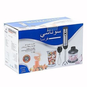 Marque : SONASHI Modèle : SHB-174JBC Couleur : Argenté Accessoires standard : Pot en plastique de 1100ml / Fouet / Support mural / Hachoir 550ml Puissance : 300 w Alimentation : 220-240v Tension : 50/60hz=