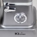 Puissance 220-240 V, 50 Hz, 1200w. 8 réglages de vitesse (+ 0/1/2/3/4/5/6 Pulse) En fonte d'aluminium, le crochet d'agitation permet le mélange uniforme d'une quantités de pâte importante En fonte d'aluminium, le crochet pétrisseur plus adapté pour les pâtes lourdes, CE levure ou Pâte a pain Fouet en acier inoxydable pour génoise légère et mousseuse blancs d'oeufs Mécanisme spécial d'engrenage robuste Bras multifonctions pivotant jusqu'a 35° Mécanisme de déverrouillage pour le bras multifonctions Circuit de sécurité Particulièrement facile à utiliser et à nettoyer Support antidérapant par ventouses Mandrin a serrage rapide pour tenir les outils=