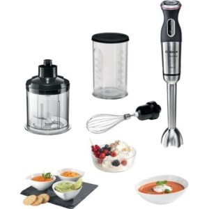Ce mixer plongeant Bosch est tout simplement parfait pour un usage domestique. Nous appre?cions son design e?le?gant et sa finition irréprochable. Sa puissance permet de re?aliser des recettes savoureuses en hachant ou mixant n’importe quel type d’aliments. La qualité allemande fiable de Bosch: le pied-mixeur inox de haute qualité est sans danger pour les aliments, sans goût et ne décolore pas. Convient à la préparation de soupes chaudes. Hachoir XL avec couvercle (750 ml) émincer des épices, noix, oignons, viande, fromage, … Fouet inox inlcus, pour monter des blancs en neige des desserts crèmeux. Bol mélangeur gradué avec couvercle pour une parfaite conservation au frais. Puissance : 1000 Watts. Nombre de vitesse : 12 vitesses. Nombre de lame : 4 lames en inox. Bouton d’éjection automatique des accessoires.=