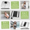 En acier inoxydable diagnosewaage avec fonction Bluetooth pour l'analyse de poids, taux de graisse, d'eau du corps, de la masse musculaire, d'os, graisse, calories dépensées et IMC (Indice de Masse Corporelle) d'organes et biologique âgeTechnologie innovante – Corps sont directement de données via Bluetooth Smart technologie transférées à votre application moderne, zusatzfunktionen via smartphone et tablette PC par téléchargement d'une application propre, GRATUIT *) pour iOS et AndroidStatistiques/auswertungen permanent mobile disponible, écran LCD multifonction de haute qualité et facile à lire (Noir/Blanc)mémoire pour jusqu'à 10 différents utilisateurs, maßeinheit en kg, lb, st?: lb (commutable) Plage de mesure de 5–180 kg par tranches de 100 gModerne Capteur Touch Control step-on automatique, maintien sûr grâce à ses pieds antidérapants