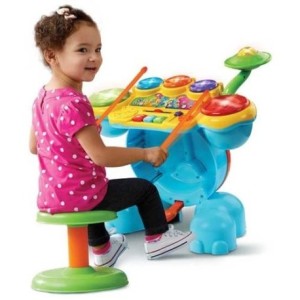 Devenez une rock star avec le Drum Rock & LeerKit dVTech'un volume réglable, d'une conception robuste et durable et d'un arrêt automatique. Choisissez parmi quatre modes et découvrez le comptage, les instruments et la musique et découvrez votre propre créativité. Placez votre pied sur la pédale pour déplacer la trompe de l'éléphant et écouter des effets sonores cool. Appuyez sur les touches mélodiques pour écouter des mélodies familières et appuyez sur la touche éléphant et les touches chanson pour écouter des chansons chantées avec joie. Appuyez sur les six lumières clignotantes du panneau de batterie pour jouer à des jeux de batterie stimulants. Ce VTech Rock & Leerkit de batterie a aussi un tabouret et des baguettes de batterie. Il fonctionne avec deux piles AA incluses.