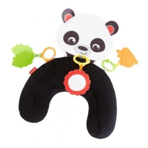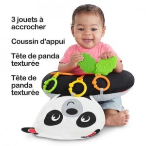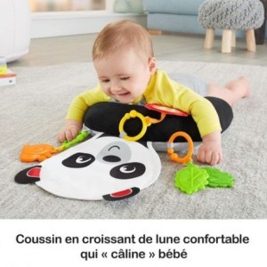 Votre enfant va adorer passer du temps sur le ventre avec son Coussin Panda Câlin Fisher-Price® ! Avec son visage qui crisse, ses oreilles satinées et ses bras tout doux qui « câlinent » votre nouveau-né, ce gentil panda soutient votre bébé pendant ses jeux et ses explorations. Grâce à ses trois jouets d’éveil à accrocher, parmi lesquels des cymbales colorées qui cliquettent, un escargot à mordiller et un miroir pour découvrir son reflet (coucou toi !), ce mignon panda est parfait pour votre bébé. Apprentissage et développement par le jeu - Motricité globale : Ce panda cajoleur aide bébé à pousser sur ses bras lorsqu’il joue sur le ventre, pour renforcer sa nuque et ses muscles profonds ! Capacités sensorielles : Ce panda a un adorable visage contrasté, des oreilles satinées et des bras en peluche pour stimuler la vue et le toucher de votre bébé. Sécurité et bonheur : Grâce à son copain panda tout doux qui le câline et joue avec lui, votre tout-petit se sent en sécurité.