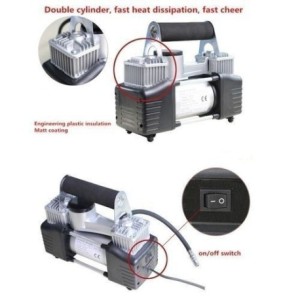 Plus de détails : DC 12V 150PSI; Double Cylinders diamètre: 30mm Débit d'air Max: 60L / min: Tension Max: 13.8V, Courant max: 18A 5m tuyau PU avec manomètre métallique 10FT cordon avec pince de batterie Tuyau d'air en caoutchouc de -1 m avec connecteur de vanne en laiton Accessoires: 2 adaptateurs de buse et 1 aiguille de sport. Capable de gonfler des pneus de vélo, des pneus de voiture, des balles d'athlétisme, etc. VENDU AVEC LE PRODUIT Compresseur DESCRIPTIF TECHNIQUE SKU: CA023OT0CBC6ONAFAMZ Modèle: Camel Poids (kg): 10 Couleur: Gris