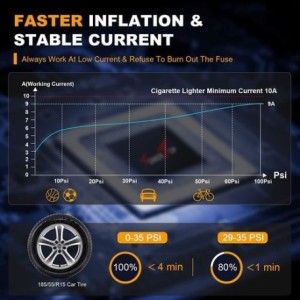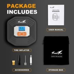 Mini Compresseur Auto et moto Dc 12 V150 PSI Version améliorée et gonflage plus rapide : le compresseur d'air TowerTop utilise le noyau en cuivre pur d'origine, le turbocompresseur pour une vitesse plus élevée. Fil de cuivre intégré avec une résistance à haute température, pas facile de faire sauter le fusible. Il fonctionne en continu jusqu'à 30 minutes et au moins 6 pneus à la fois. Le gonfleur de pneu peut gonfler un pneu 205/55R16 à 30-35 PSI en moins d'une minute. ?Préréglage intelligent et mise hors tension automatique précise? : le compresseur d'air de gonflage de pneu portable prend en charge le préréglage de la pression requise par les pneus, avec détection automatique de la pression des pneus et mise hors tension automatique, pas besoin de s'inquiéter d'un surgonflage ou d'un gonflage insuffisant. En raison de l'optimisation des performances des pièces internes et de la mise à niveau du repose-pieds, le bruit et les fluctuations lors du gonflage sont réduits de moitié. AFFICHAGE NUMÉRIQUE LCD ET 3 MODES D'ÉCLAIRAGE À LED : la pompe à air pour pneus de voiture est équipée d'un grand écran de haute précision et plus lumineux qui vous aidera à calculer les valeurs requises (PSI, BAR, KPA, KG/CM²). Avec 3 modes d'éclairage LED lumineux : lampe de poche standard, rouge clignotant et SOS d'urgence pour une utilisation nocturne facile, vous pouvez voir clairement pendant que vous regonflez les pneus la nuit ou effectuez des réparations rapides sur une route de campagne sombre et solitaire. ÉCONOMIE D'ESPACE ET POLYVALENT - Le compresseur d'air portable au design compact le rend beaucoup plus facile à utiliser que les pompes à pneus traditionnelles dans une station-service, et vous n'êtes pas coincé à faire la queue ou à faire défiler pour changer de rechange. La pompe à air de voiture dispose d'un cordon d'alimentation de 13,2 pieds qui permet d'accéder à tous les pneus de votre voiture, vélo, moteur, VTT, SUV compact ou de taille moyenne. (Les gros camions et les camions motorisés ne sont pas pris en charge) Ce que vous obtenez : 1 gonfleur de pneu numérique, 2 adaptateurs de buse, 1 aiguille à bille, 1 fusible de rechange, 1 sac de transport, 1 manuel d'utilisation