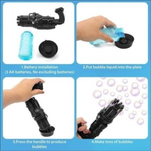 Intéressant? Les Bubble ont 8 trous à bulles pour souffler des centaines de bulles colorées par minute. la conception innovante des jouet à bulles et la bulle colorée répondent également aux préférences des enfants et attirent leur attention. ?Matériau sûr? Le jouet à bulles est fabriqué en matériau ABS respectueux de l'environnement et non toxique. Les enfants peuvent le transporter en toute sécurité et profiter de la chasse aux bulles. ?Gatling Bubble Machine?Notre machine à bulles est fortement imitée par Gatling, restaurant l'apparence de Gatling, permettant aux enfants de ressentir le sens de la réalité en jouant, et notre jouet est d'ajuster les parents et les enfants Notre meilleur partenaire pour la communication ! ?Facile à utiliser? Nos jouets à bulles colorés sont faciles à fixer et à utiliser, en utilisant 3 piles AA (les piles ne sont pas incluses) et sont livrés avec 118 ml d'eau à bulles. Versez l'eau à bulles dans l'assiette complémentaire, trempez le jouet à bulles dans l'eau à bulles et appuyez sur l'interrupteur. Profitez de leur temps de bulle. Pas besoin de solutions désordonnées. ?Cadeau parfait? : vous voulez profiter de beaucoup de plaisir estival à la maison ? nos jouets à bulles sont le choix parfait pour les cadeaux d'anniversaire, les cadeaux de fête des enfants et les jouets de plage, les jouets de bain! Que vous soyez seul, avec votre enfant ou avec toute la famille!
